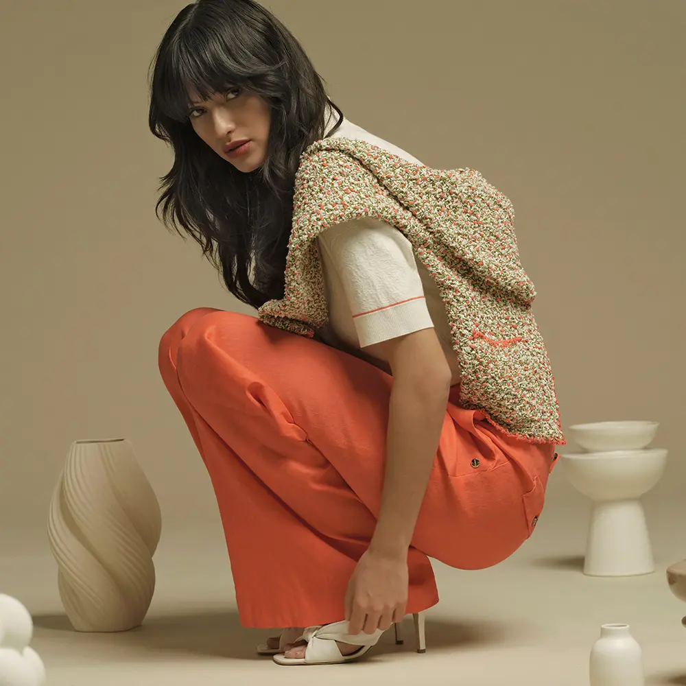 Red pants combined with a knitted polo shirt and patterned bouclé jacket – a look that balances sophistication and travel chic.