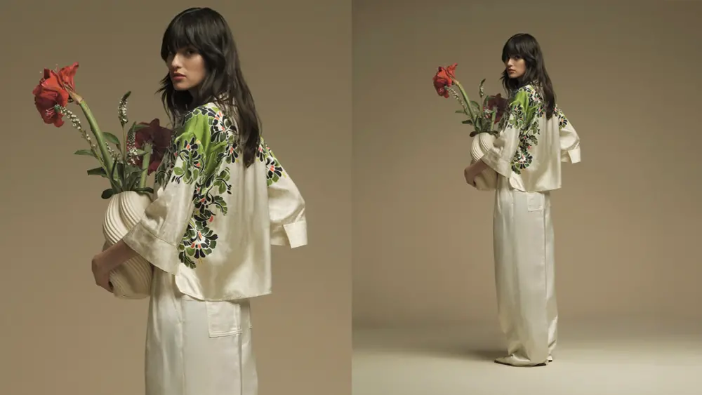 The combination of satin jacket with a slight sheen and relaxed knit shorts creates a subtle dynamism. Perfect match: mini bag with bamboo handle and suede heels.